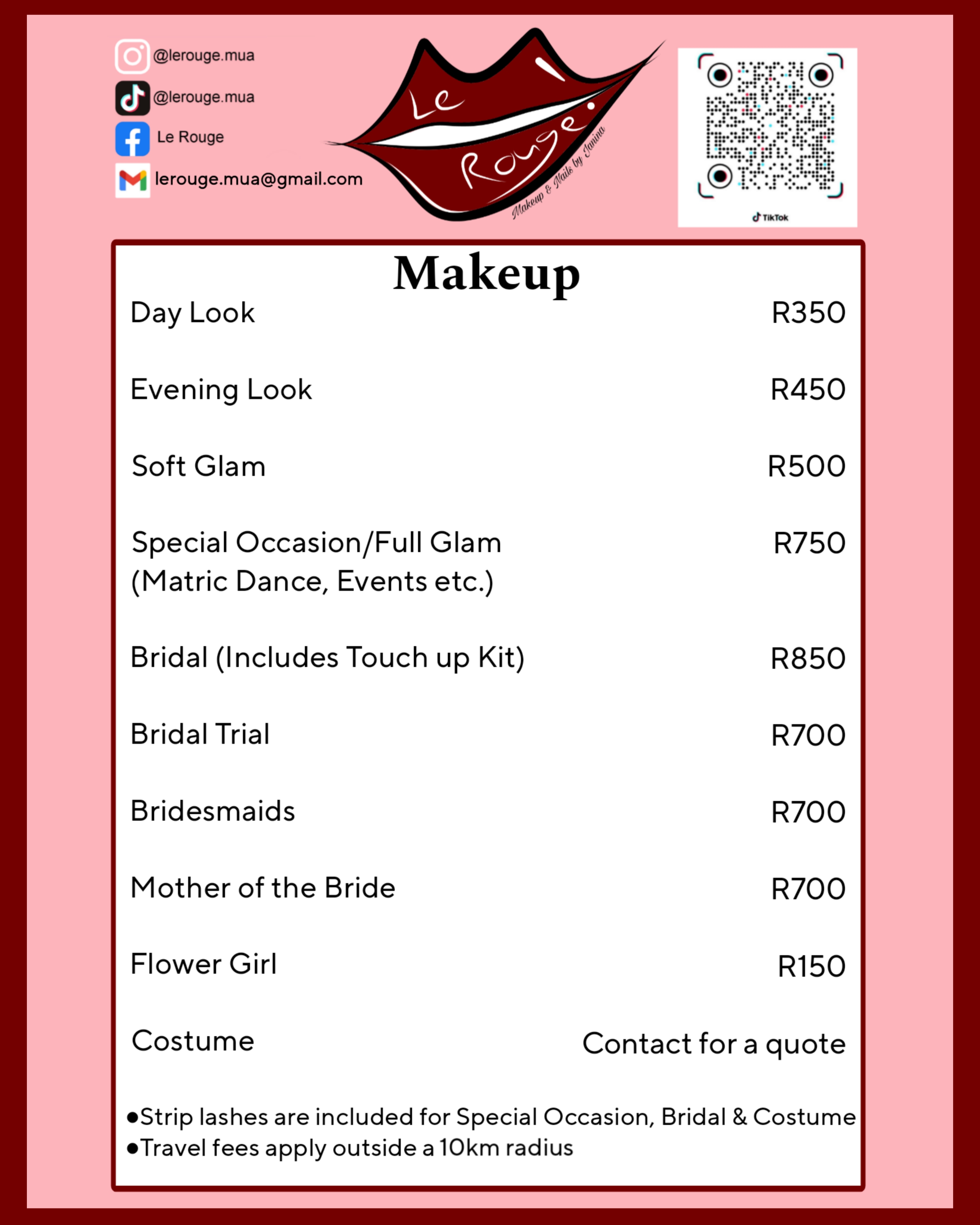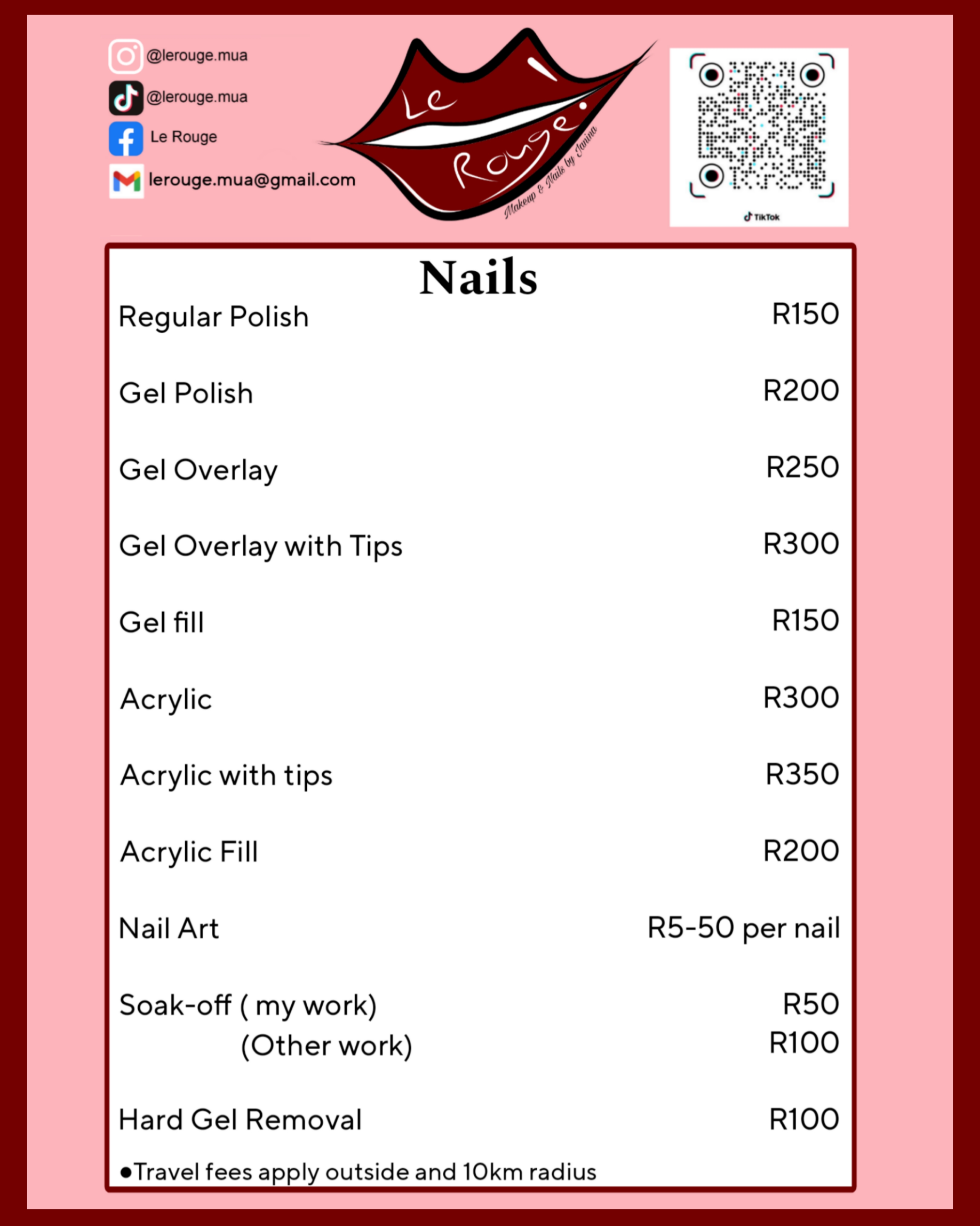 Le Rouge provides makeup and nails services. This is a home-based business but we can also travel to you. We offer a variety of makeup services from every day and soft glam to full glam, Bridal, matric and even costume. For our nail services we offer gel, acrylic and regular polish and a variety of art.