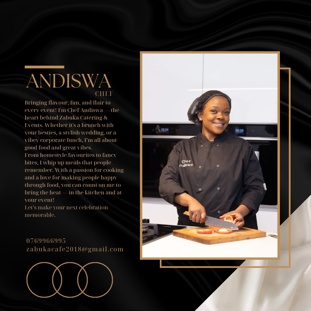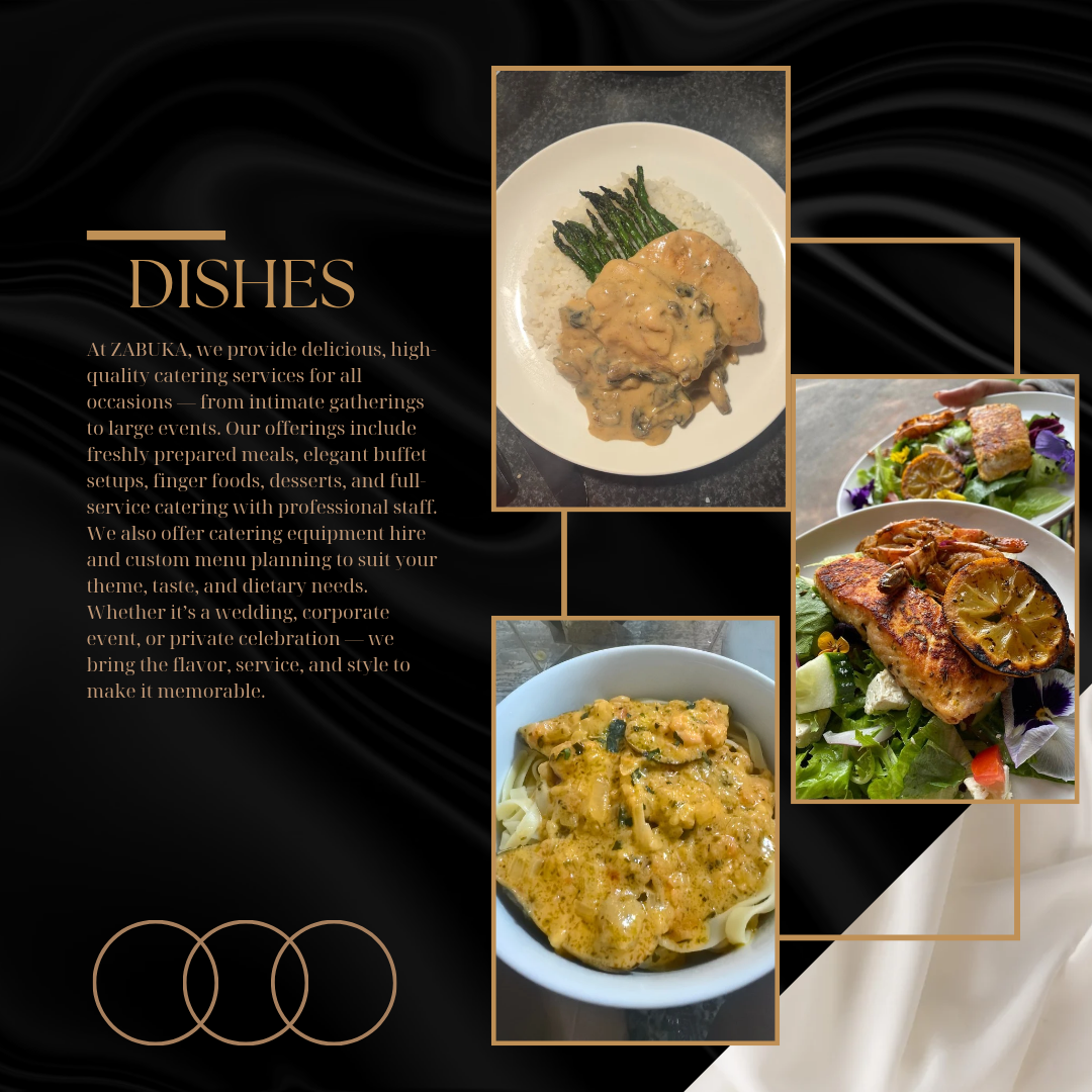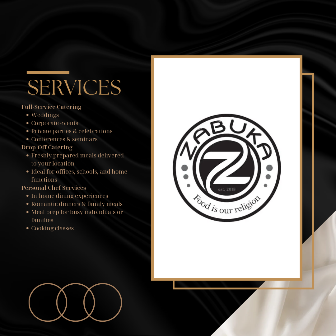 Zabuka Group is a dynamic catering and equipment hire company dedicated to delivering exceptional culinary experiences and seamless event solutions. We specialize in modern African cuisine, offering tailored catering services for private functions, corporate events, and special occasions. Our all-in-one approach includes professional chef services, stylish waiter staffing, and a wide range of catering equipment for hire — from elegant table settings to functional kitchen gear. At Zabuka Group, we bring flavour, flair, and functionality to every event.