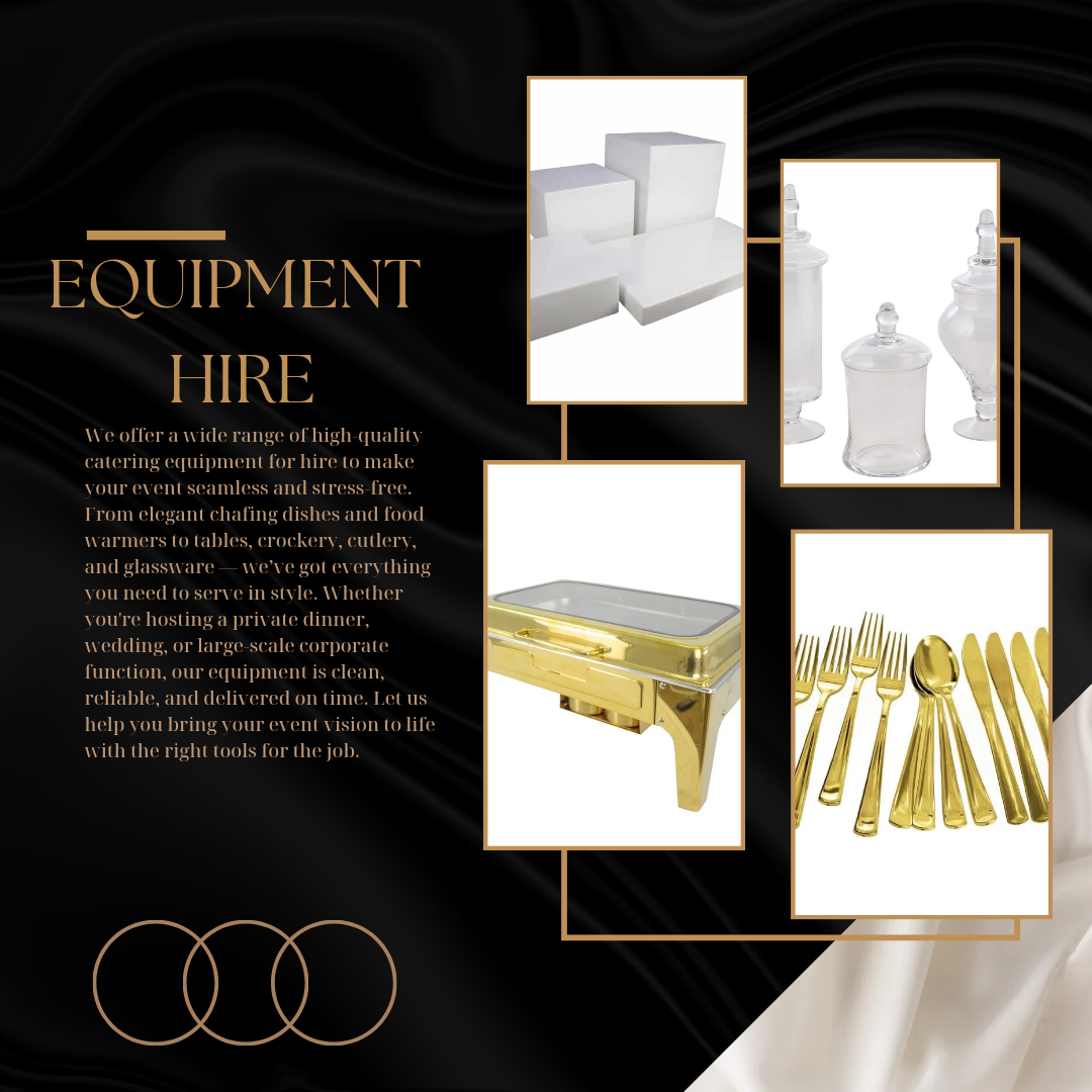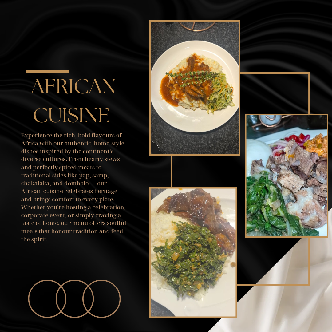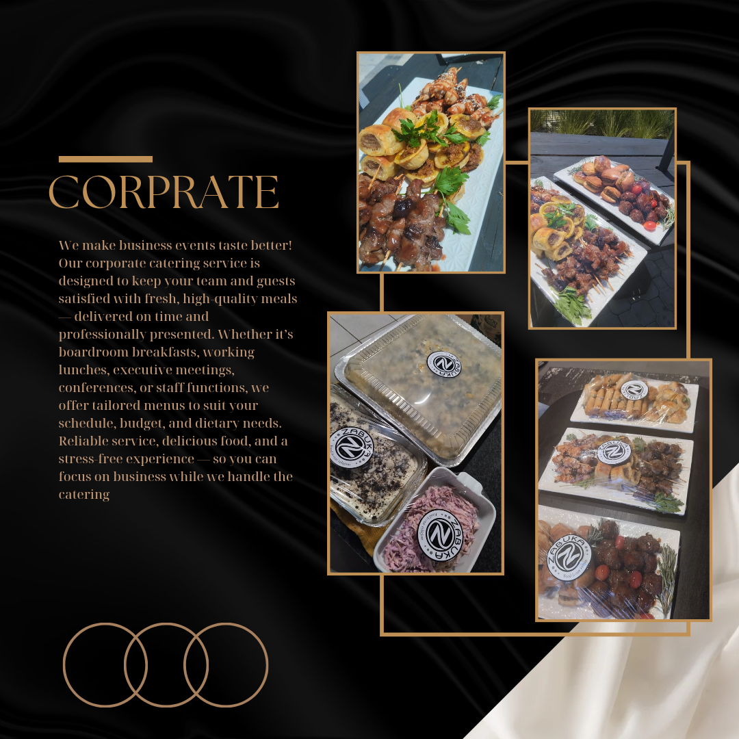 Zabuka Group is a dynamic catering and equipment hire company dedicated to delivering exceptional culinary experiences and seamless event solutions. We specialize in modern African cuisine, offering tailored catering services for private functions, corporate events, and special occasions. Our all-in-one approach includes professional chef services, stylish waiter staffing, and a wide range of catering equipment for hire — from elegant table settings to functional kitchen gear. At Zabuka Group, we bring flavour, flair, and functionality to every event.
