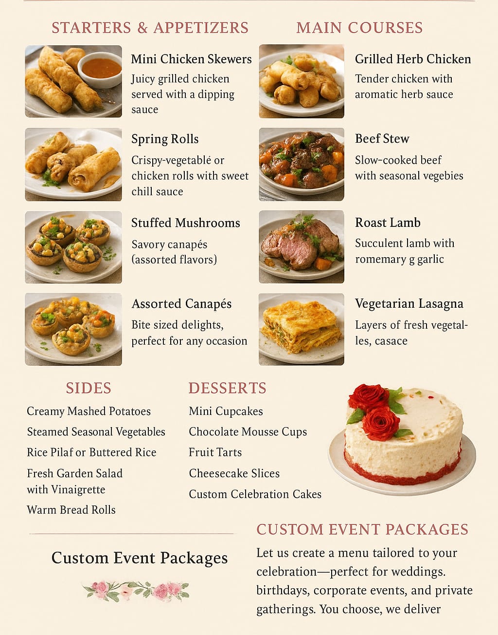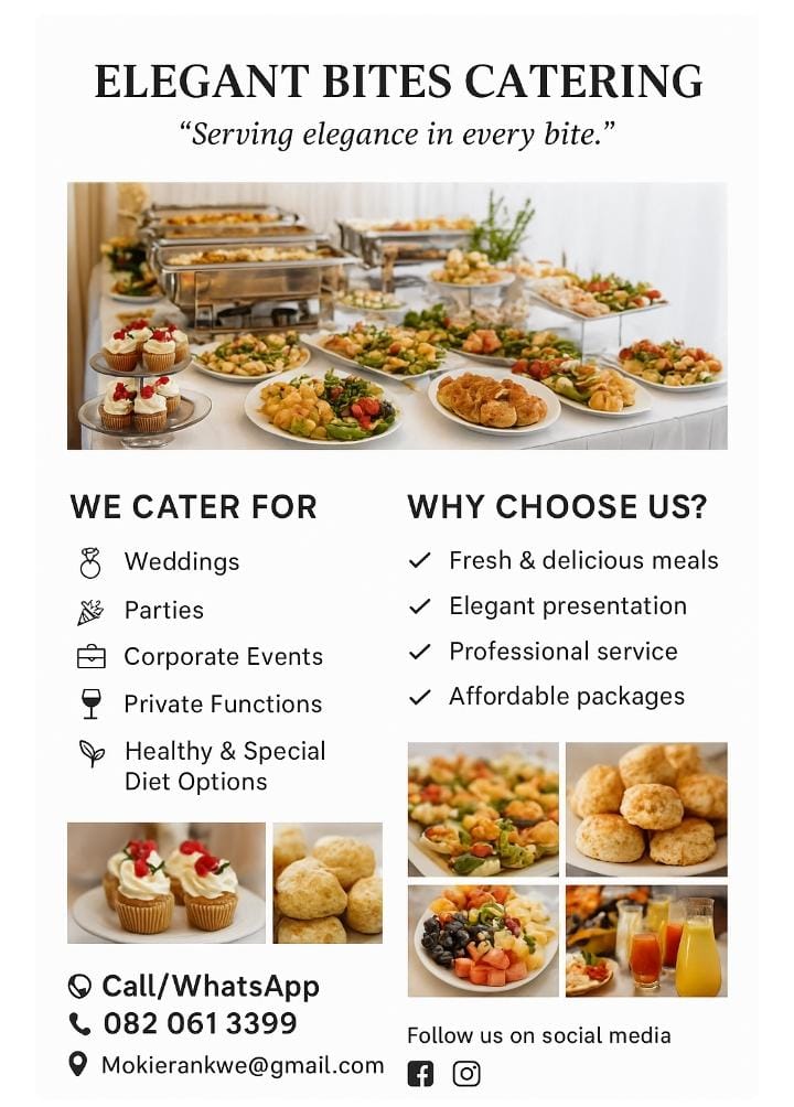 Elegant Bites Catering is a premium catering service based in Johannesburg, dedicated to bringing delicious, high-quality food and exceptional service to every event. We specialize in creating memorable culinary experiences for weddings, birthdays, corporate functions, and private gatherings. Our menu offers a variety of options, from classic comfort foods to gourmet dishes, including healthy and customized choices to suit every client’s needs. At Rosey Catering, we pride ourselves on attention to detail, presentation, and personalized service, ensuring that every event is seamless, elegant, and unforgettable. Whether it’s an intimate gathering or a large celebration, we bring flavor, creativity, and professionalism to the table. Our Services Include: Event catering (weddings, birthdays, corporate events) Buffet and plated meals Finger foods and canapés Custom cake and dessert services Menu planning and event consultation